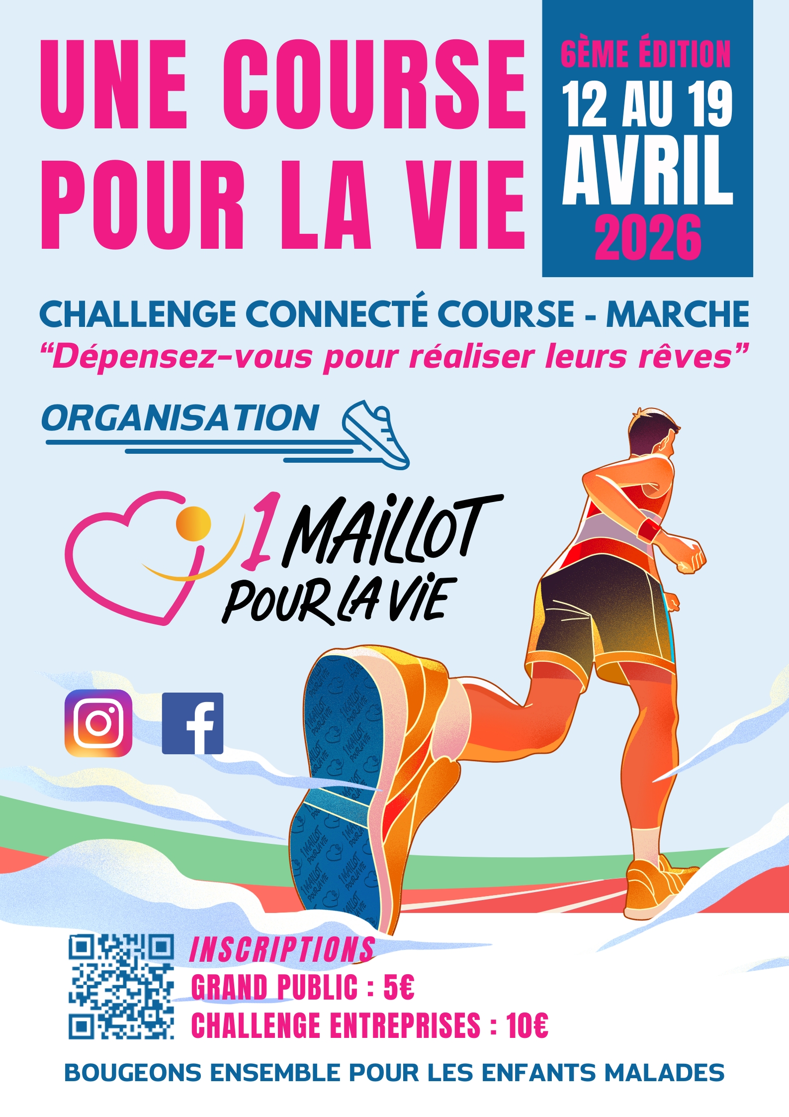 L’événement « Une Course pour la Vie » est une course virtuelle sur distances libres à travers toute la France, organisée par l’association « 1 Maillot pour la Vie ».